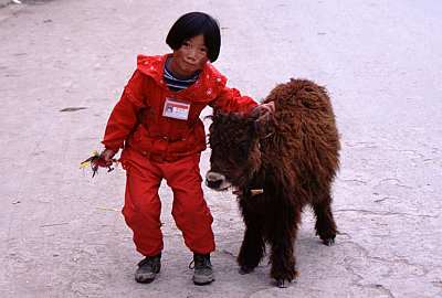 ジュクンドの街角で、下校中の子供達に出会う。ヤクの子牛と一緒におどけて見せた。