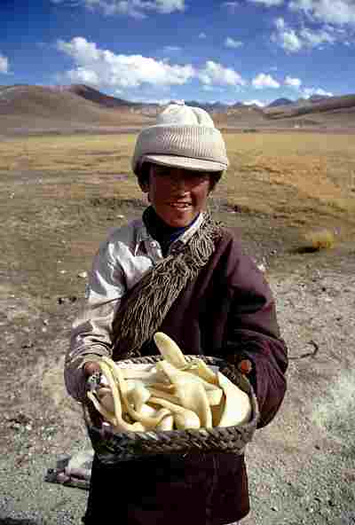 道脇で伯母さんと少年が自家製のチーズを売っていた。ヤクのミルクから作りたてのチーズはすごく美味しい。ついでにバター茶もご馳走してくれた。2-3日もすると固くなってしまうし、ラサの街では見かけなかったので、新鮮なチーズは至上のごちそうだ。