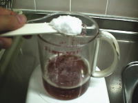 (2) 漬け汁は、計量カップにビールを135ml入れ、砂糖100g、塩大さじ2、赤唐辛子を加えて作ります。