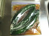 (1) ジッパー付きの袋に洗ったきゅうりを入れ、漬け汁を注ぎます。