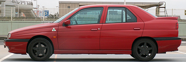 実際は、表のアウディ80までが2L級セダンとして横並びに比較されるべきクルマ達ですが、その中で155はホイールベースが短い、つまり一クラス下からの派生種であることがわかります。ご存じティーポ2/3シャシの影響ですね。似たようなことは、ゴルフIIIベースのヴェントにも見られます。 年々同クラス車のボディが大型化していく中、ここに示した95年セダンたちの中では、もとが92年デビューの155は新しい部類に入らないのでやや不利ですが、それでもモデル末期のアウディ80、PEUGEOT405やデビューが155より前のBMW3でももっと長いホイールベースをもっていますので、155のボディは小さい部類といって良いと思います。 シトロエンZXやPEUGEOT306並ということからも、一クラス下のハッチバック用ホイールベースということが見えてきます。まさにフィアット・ティーポにドンピシャのホイールベースですね。 全長に目を転じると、長い部類には入らないもののそれほど他車と比べ短くなっていません。シトロエン・エクザンティアとの比較だと、あちらはホイールベースが155より200mmも長いにも関わらず、全長は同じです。シトロエンの、「ロングホイールベースに短い全長」はBXでも実現していた特長のひとつでもあるので、あれはあれで特別ですが、それにしても155は全長を切り詰めていないことがわかします。ひとつはV6を収めるためのフロントオーバーハングが効いているのでしょう。あと分厚いトランクを寸詰まりに見せないためにもリアオーバーハングも切り詰めていないのでしょう。 こうして見ていくと、155V6というクルマの特殊性が見えてきます。クルマの格は、ホイールベースからみる限りわかりやすくいえば、PEUGEOT306です。3HB並というのが乱暴だとしても、同年代の2L級セダンより小型なクルマであることは確かです。 2Lを積んだTSにしても、比較的小さなボディに大きめのエンジンということができるぐらいだと思います。これに2.5LV6を積んでいるのですから、小さなボディに大きなエンジン、その逆がフランス的だとしたら、いかにもイタリア的発想のクルマなのかもしれません。小さなボディに高出力を与えるときに、難しい飛び道具を使わず、単純に排気量を上げるという発想。ここを2.5LSOHCV6に留めたところがなんともいえない匙加減ですね。 しかもこの高出力V6バージョンが無目的。ホモロゲを取るためでもレースに出るためでもなく、ただ積んでみたかったから積んだ、といった感じです。しかも売り上げは散々であったことから確固とした売り上げを見込んで積んだわけでもないでしょう。その割には最初から積む気で設計してますけど。 なんで、この大きさのボディに2.5LSOHCV6というなんともいえないポジションイングのエンジンを積んできたのか?乗っている人でそれぞれ使い方、楽しみ方を考えてください、ということでしょうか。 | |||||||||||||||||||||||||||||||||||||||||||||||||||||||||||||||||||||||||||||||||||||||||||||||||||||
