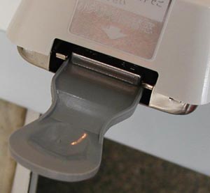 押え金のネジでボタンホール器本体を付けます。本体の固定はネジ1本ですから、シッカリ締めます。
