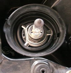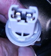 配線ソケットを抜きます。 ロックもなにもないので、垂直に抜けばOKです。 そのあとゴムのカバーを外し、バルブを押さえている針金をはずし、バルブ本体を抜き取ります。 |