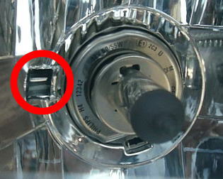 ポジションランプは、左に(正面から見ると右)へ回して抜きます。 写真では分かりませんが、前から見ると切れ込みが分かります。確認してひねってください。 |