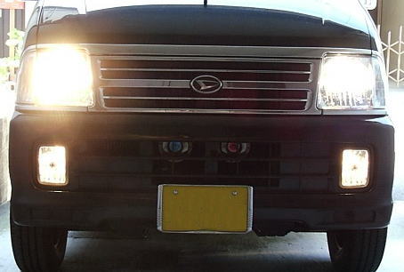 | 向かって左がノーマル、右が交換したものです。 昼間の写真でよく分かりませんが、なかなかいい色です。 明るさ自体は、あまり変わったように思いませんが、私には十分です。 ところで、この作業で手は傷だらけです。特に右ライトは、スペースが狭すぎて、私の手の大きさでギリギリでした。皆さんも作業をする時はバンソウコウは必携です。 |