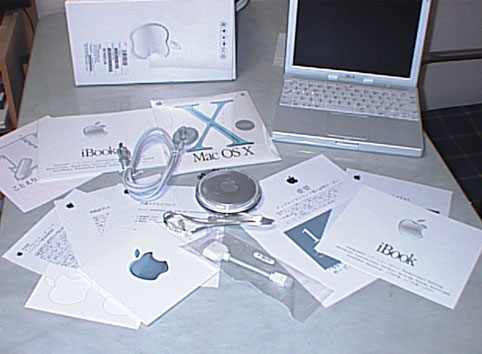 | PowerBookG4を断腸の思いであきらめましたが、新iBookの登場にはいてもたってもいられず、予約買いしました。Macを実物を見ずに購入したのは初めてです。 |