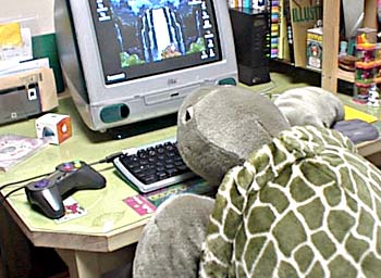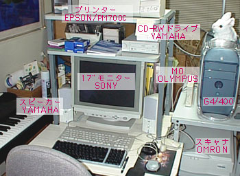 | モニターは、切り替え器を使ってG4と兼用しています。パソコンラックの下段に置いているのでマシンの本体は写真にうつっていませんが、今もしっかり使っています。SCSIでMOとスキャナを接続しています。このマシンだけがプリンタにつながっています。データはEtherNetでimacやG4やりとりしています。かなり「遅い」マシンですが、そのおかげで4400に住んでいるPostPetのカメは、まったりと、なんともいえぬのんびりした動きをしてくれます。 |