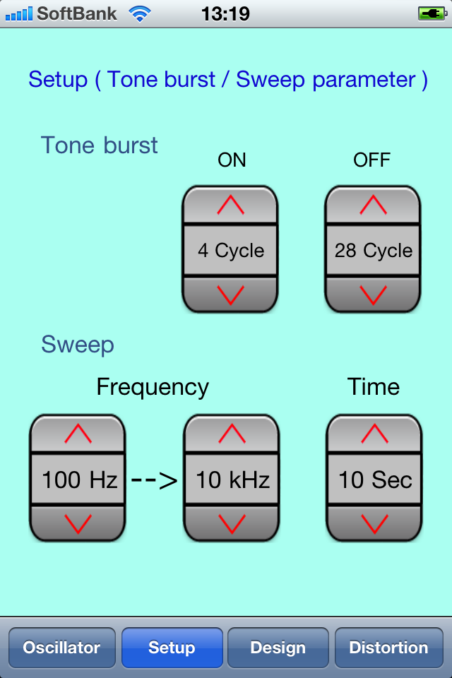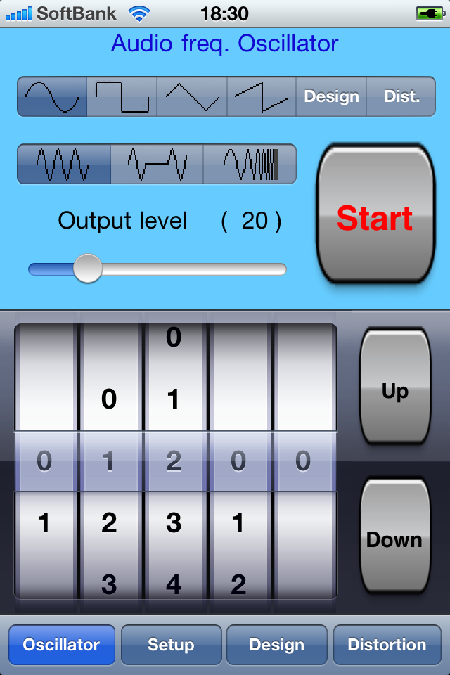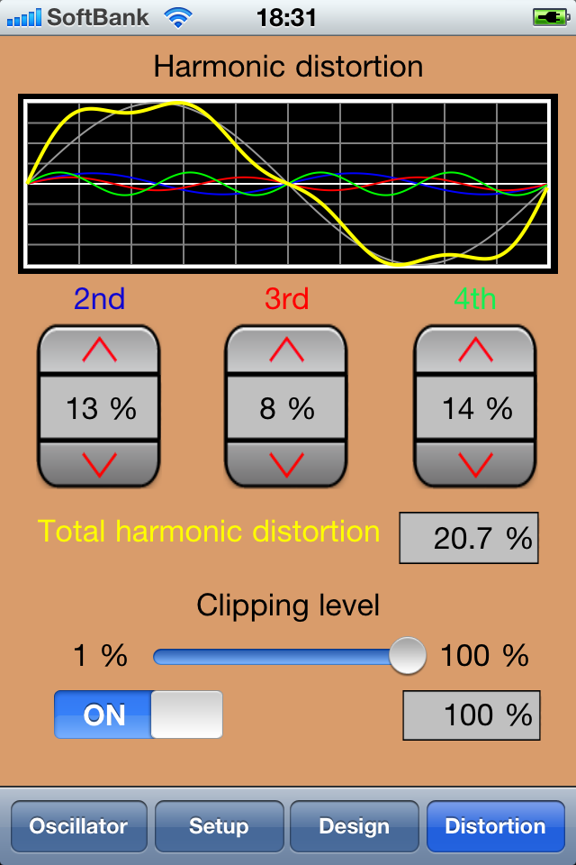 [ Usage ]1. This app is composed of four views which are "Oscillator", "Setup", "Design", "Distortion " and changes each view with the tab below.