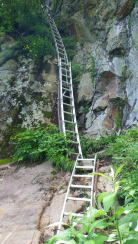 夜行列車で松本駅に着き、新島々まで電車、そこからバスで上高地バスターミナルまで移動した。バスターミナルで帰りのバスの乗車整理券をもらってから歩き始め登山口まで約30分。これから登る焼岳は日帰りで登れる北アルプスの山、そして唯一活発な火山。林道から登山口に入り森の中を歩いていく。途中、川や橋(写真左上)を渡り、何度か梯子(写真下中は一番長い梯子)を登ったり、クサリ場を通ったりしながら高度を上げて行く。
