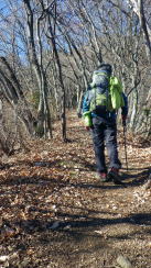 道の凹凸の状況がわかりにくく、坂道では滑りやすいので注意しながら歩く。今日は尾根道を歩きながら、人がほとんどいないので、三脚を使って自分撮りにチャレンジ(写真中段)。