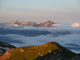 西側はさすがに百名山、景色は極上(写真右下)。その後無事に下山した。 |