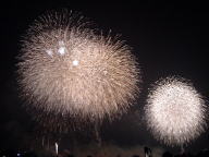 | ビール片手に持ち込んだ晩飯を食べながらの見学、、、う〜ん贅沢。 ラジオの実況放送では、人出は70万と言っていた。 確かに土手は見渡す限り頭です。。。 |