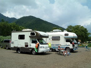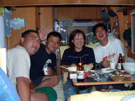 | 今晩はTommyさんちのデイブレイク(通称:ボンちゃん)にお邪魔して飲んじゃいます! しか〜し!一升瓶を抱えて話し出すこと30分、「コンコン」とボンちゃんの壁を叩く音。 窓を覗くとFIXにお乗りのmicさんが! ・・偶然だったのでビックリでしたが、旅先で会うと妙に嬉しいものです! 総員飲むのを中断して、外に出てご挨拶。 その後、我が家のジルに場所を移して飲み直しました。。。 楽しさのあまり、あっという間に一升瓶は空・・ちょっと飲みすぎたかな? でも、久々に腹から笑いました! ・・皆さん、とても楽しかったで〜す。 micさん&杏さん、またご一緒しましょうね♪ |
