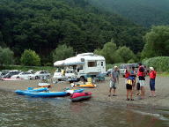 | 買出しを済ませPICA西湖に到着。 ここはとてもいい感じのキャンプ場ですが、ゲスト用駐車場から湖までは遠かったですね。 FUMIさん達にご挨拶だけ済ませ、湖畔に駐車して出艇できるところを探しに出ます。。。 ちょうど対岸にある某キャンプ場の隣のスペースがなかなか良さそう・・早速、Tommyさんと移動です。 |