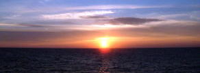 | 夕日に染まった空と海はとても感動的…、幻想的であり旅情盛り立てる素晴らしい光景でした。 再び船室に戻ってからは全員でゲームをしたりして遊びました。 そうそう、車での長距離キャラバンも楽しいですが、私には移動中にこういった時間はありません。 船旅ならではの家族との団欒〜とても楽しかったです。 で、楽しい時間は過ぎるのが早いもの…、私は眠ることは出来ませんでしたが「明日は早起きだ!」ということで22時に消灯となりました。 |