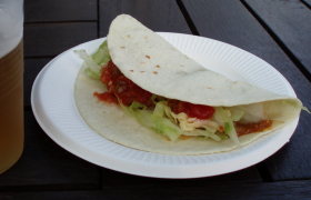 プレハブ屋台長屋では、「ジャックポット」というタコスの店もあります。基本のやつは200円というのがいいですね。これなら気軽に手が伸ばせます。世界のビールが5種類くらいおいてあるので、これもちょっと楽しい。