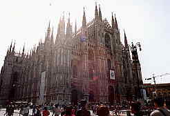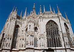 ゴシック様式の大聖堂、ドゥオモ。135本もあるという尖塔が空に突き刺さりそうな感じです。ちょうど日曜日のミサが行われていたところでした。大きなステンドグラスに囲まれて、沢山のロウソクの光と