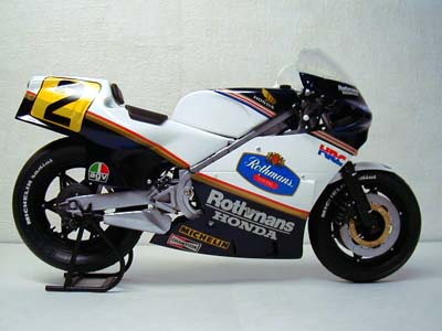 | ほとんどストレート組で製作したにもかかわらず、古いキットというだけあってかなりてこずりました。 まず、パーツのバリがひどくて、バリ取りだけで相当時間がかかりました。 この頃のタミヤのバイクモデルはチャンバーの裏側とフロントフォークのアウターチューブの裏側がなぜかくりぬかれていて、それを埋める作業が必須となります。 この作業が単純なのですが、結構手間がかかりました。 シートカウルからのぞくサイレンサーは、5ミリのプラ棒の直径を一回り削り込んで製作。 キットを買ってから10年ほど経っていたので、さずがにデカールは使い物にならず、新たにアフターサービスで取り寄せました。 絶版になってから年数の経過した模型にもかかわらず、タミヤにデカールが残っていたのには感心しました。 塗装し終わったシートカウルを取り付けようとしたら、合わせ目から割ってしまうなど、仕上げ段階でかなり苦戦しました。 まあ、この時代のキットだから仕方ないといえばそれまでなのですが。(^_^;) この時代のキットの難しさと、最近のキットの出来の良さを痛感した1台でした。 |