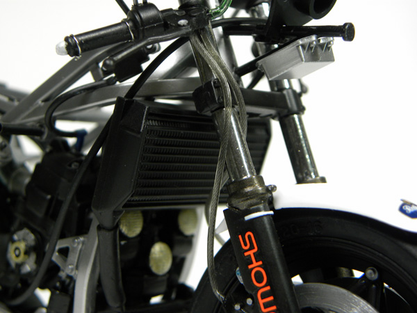 チャンバーの裏打ち、カウルステーのインフレーム化、アクセルワイヤーの基部とワイヤー追加、下側サイレンサーエンドを真鍮パイプに置き換え、インナーフォークはメタルシールで再現、アクセルのワイヤリング再現・・・と言ったところでしょうか。