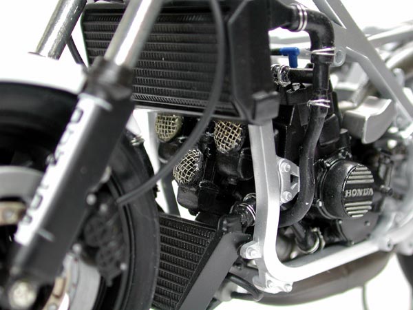 ディテールアップパーツを使用したことでクラッチのモールドや上2気筒分のサイレンサーなど多岐にわたって加工してます。