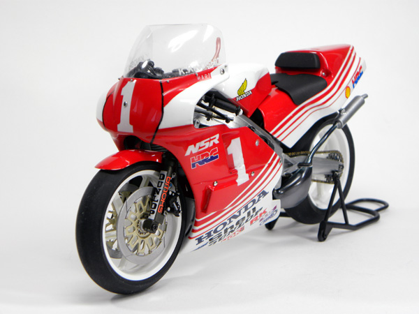 1987年 木下選手がホンダワークスとして最後の年に駆ったNSR500です。 この年は最終的にランキング2位を得るもののホンダのライダー若返り計画(?)により、翌年はホンダを離れプライベーターとして全日本GP500に参戦することになります。 当時、高校生だった私にはこのホンダの決定がすごく冷たく感じ「ホンダはライダーを大切にしないメーカーなんだな」と思った記憶があります。 1990年に八代選手を放出した際にさらにこの想いは強くなったのですが、それはまた別のお話。。。(^_^;) 作品の方ですが、DESAIGN UTA製のガレージキットを使用。 キットはレジン製でカウルを付けた状態での再現を目的としていたので、チャンバーが半円だったり、シートレールやラジエターがオミットされていました。 また1986年NSR500をドナーキットとして使って「目に見えて違う場所」だけパーツを置き換える仕様となっています。 そこで、ストリップ状態で観賞出来る最低限のパーツ追加と改造、86NSR500との違いで気になる所を中心に加工を施しました。 リアスイングアームの形状を87仕様に変更。 リアサスのリンクは86NSR500とは大きく違っていたのでタミヤキットのパーツを流用しつつ改造。 チャンバーはカウルから見える部分がそれっぽくなってる仕様で形状がまったく違ったので、ほぼ作り直しています。 このチャンバーの形状と位置の相互関係を上手く出せなくて苦戦しました。(^_^;) シートレールとラジエターはオミットされていたので追加。 シートレールはとりあえず「ある」だけのなんちゃって仕様です。 ラジエターは形状が似ていたRC30用を流用。 冷却水のパイプはプラ棒を現物合わせでライターで炙りながら曲げるという古典的な手法で製作。 エンジン本体もクランクケースを作り直したり、シリンダーを加工したりと結構手を加えています。 カウルはキットのままで充分雰囲気が出てたのでほぼそのまま。 チャンバーを収めるためにシートカウル内側を削ったくらいです。 スポンサーロゴはキットのものでイメージと違うものをジャンクから流用。 一部のデカールは自作しています。 スクリーンは塩ビのバキュームで自作。 ちょっと大きい気がしますが、まあ、許容範囲です。(^_^;) 他にもこまごまと手を入れてます。 UTAさんのキットはそのままでも充分見映えるのですが、素材としてのポテンシャルが高いのでついつい手を入れてしまいます。 その結果、キットのバランスを崩して苦戦しちゃうのが毎回のパターンとなってきていますが、自分なりに素材の良さを引き出してる・・・つもりなので作っていて楽しいです。(^_^) 今回のNSR500の完成で1983年〜1989年の木下選手の500ccマシンが各年1台は揃いました。 後は1985年のNSR500と1981年、1982年のYZR500でコンプリートです。 時間はかかると思いますが、いつかやり遂げてやろうと思ってます。(^_^)