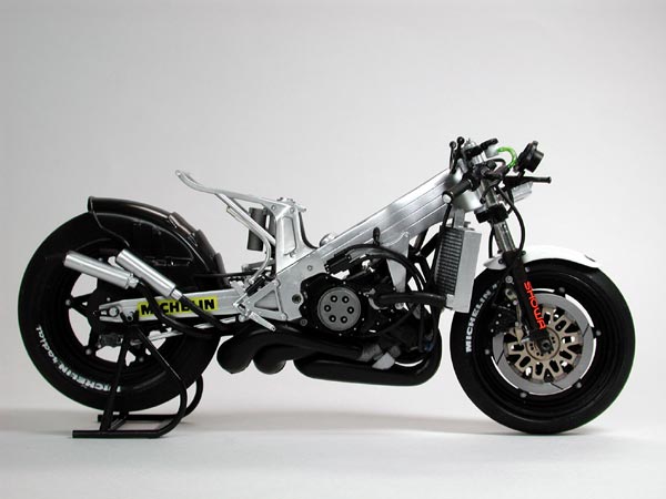 フレディー・スペンサーがWGPで500ccと250ccのダブルタイトルを獲得した1985年のNSRです。 完成後数年が経ち、塗装などに傷みが出てきたこと、また最近のスキルから見て作品の「粗」が気になるようになってきたことなどでリペアしたのがこの作品です。 新規で作り直そうかとも思ったのですが、製作当時に出来る事はすべてやったと言うこともあり思い入れもある作品でしたので、あくまで「リペア」という形にこだわりました。 今回初めてリペアと言う形で製作したのですが、これはこれでなかなか楽しかったです。 |