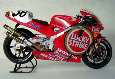 | キット本体は、ほぼストレート組みで組み上げてます。 唯一の変更点は、シートカウルのビスを虫ピンに置き換えたくらい。 それも今まで手に入らなかった虫ピンが、たまたま手に入ったので、どうしても使ってみたくなってという理由で・・・。(^_^) チャンバーの溶接部のサンディング表現はメタルテープを細切りしたものをチャンバーに巻き付け、その上からクリヤブラウンで塗装しています。 この手法は、バイクモデラーのUTAさんの手法をパクリ(?)ました。(^_^;) UTAさんほど上手くいかなかったので、もう少し研究の予知ありですね。 (ちなみにUTAさんのHPはリンク集にリンク貼ってあります。) リヤフェンダーのカーボン地は塗装で表現しましたが、やはり写真じゃ分かりづらいですね。 手法自体は、いつぞやのモデルグラフィックスに載っていたタミヤワークスの手法。 全体にブラックを塗り、メッシュでマスキングしてメタリックグレーを吹きつけ、その後スモークグレーで調子を整える、というもの。 マスキング等をいい加減にしても比較的イイ感じに仕上がるので、リヤフェンダーのようなカーボンデカールを貼るのが難しいパーツには効果的です。 デカール貼りが苦手な私にとっては、こちらのほうがラクですし。 ラッキーストライクカラーのデカールは「あつし橋ブランド」製。 このデカールはパソコン用プリンターで出力しているという特性上、デカール表面が非常にデリケートなため、クリヤコートが必須になります。 今回もクリヤコートをしていますが、その後の研ぎ出しに見事失敗し、デカールまで削ってしまいました。 幸い「あつし橋ブランド」製のデカールは1セットに2枚のデカールが入ってるという超親切製品でしたので、スペアのデカールを貼り、無事乗り越えました。 このタイプのNSRは「あつし橋ブランド」だけでも、多くの様々なデカールがリリースされているので全部作ると結構な数になります。 ・・・だもので、なるべくストレートで組んで数を組むか、ひとつふたつに絞り込んで作り込むかになるのでしょうが、私はどちらかというと前者のタイプですね。 ただ、数を組むと言っても、そうそう進まないのが現実ですが・・・。(^_^;) |