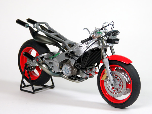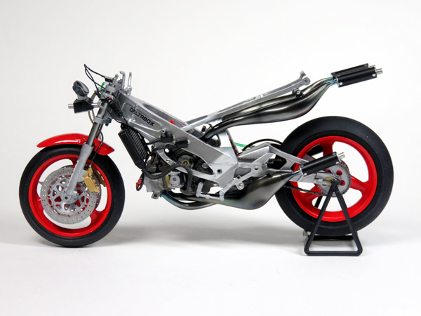 レジン製で、カウルを外した状態を考慮しないタイプだったので、シャーシ関係はチャンバーが半円だったり、ラジエターがカウルと一緒につけられたりとオミットされた仕様となっています。