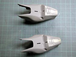 パーツを接着したら、パテを盛る前に一度おおまかに成形します。 鉄ヤスリ、デザインナイフは当然のこと、最近はリューターまで使って成形します。 最新キットならカウルの成形くらいに鉄ヤスリはありえないんですけどね。(^_^;) |