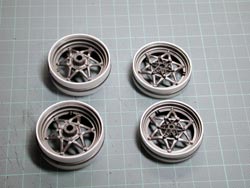 最近、製作日誌ではお馴染になってきた「なんちゃってインチアップ」。(^_^) 0.75ミリのプラ板を一定幅で切りだし(フロント4ミリ幅・リア6ミリ幅)ホイールのセンターリブ部に沿って貼り付けます。 |
