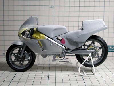 | 構想時には'86NSR500のアッパーを幅詰めしようかとも思ったんですが、最初から幅のあってる(ハズの)NSR250のカウルを使って形を似せる方が早いと思ってたんですが、思った以上に形が違ってて、その上、元のパーツの形に引きずられる形になってしまいました。 この時はまだ、似てはいないとは思ってましたが、そこまで苦労するとは思ってなかったんですよね〜。(^_^;) |