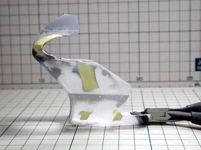 | 透明パーツの加工は本当に形が掴みづらいです。 しかも透明のプラは固く脆いので加工もしずらい上に簡単にパキパキ割れるので難航しました。 |