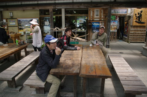 さて、今回よりご参加いただいてますSさん(中央)。というか、テーブルの3人は、みな「S」さんですが。 大豊で合流して、ただいま道の駅「土佐さめうら」です。 |