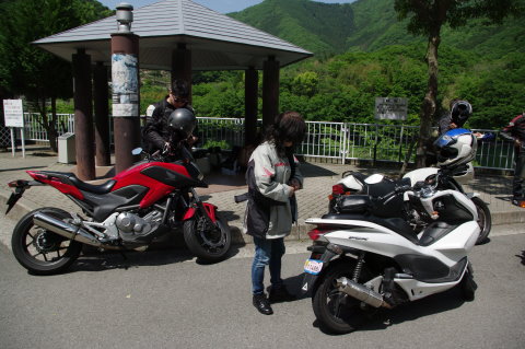 そして着きましたのは、四国カルスト。 いい天気で景色もいいのですが、なぜかバイクの点検に熱中する人たち。 |