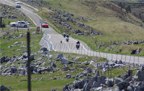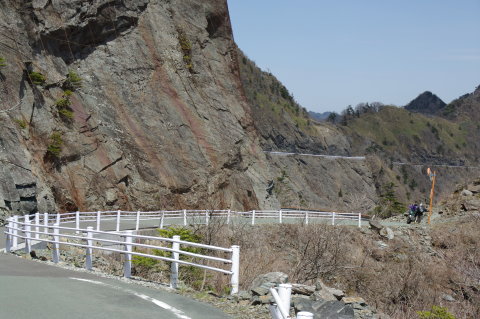 翌日は国道33号線を経て、四国カルストへ向かいます。 写真は33号線から439号線へ入ったばかりのところ。 止まると、なぜかバイクの点検大会が始まります。 |