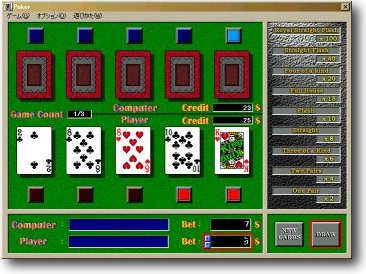 遊びかたはいたって簡単! 画面構成は上がComputer、 下が自分となっています。 ゲーム メニューからスタートして、右下の NEW CARDSボタンを 押します。 換えたいカードの下の赤い ボタンを押します。 BET(掛け金)を決定して、 DRAW ボタンを押すだけ。