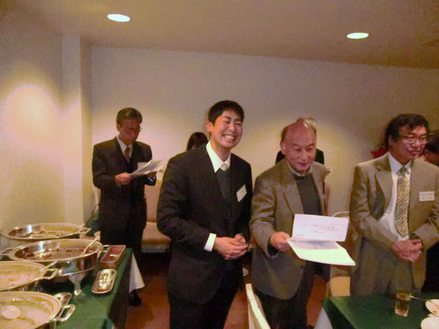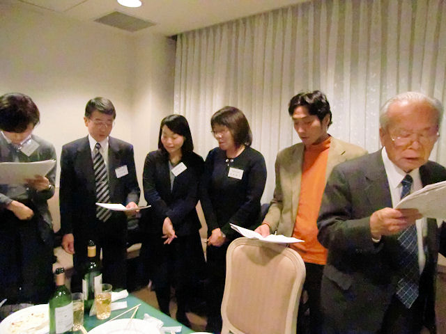 「懇親会」では初めに上原副会長の「開会祈祷」で参加者一同敬虔な祈りを捧げました。私は、挨拶の中で青山学院創立140周年を機に策定された「アオヤマビジョン」に示され青山学院の使命である「サーバントリーダーの育成」についての話や、「同窓会による補講」の活動の様子、補講に参加した学生からのアンケートの感謝の言葉や、都道府県別の教員採用試験合格者数について、さらには、昨年に続いて教職課程主任の小林教授からいただいた感謝状の披露等をしました。参加者はご来賓の梅津院長と教授の方々(鈴木教授、早坂教授、横山教授、河本教授、小林教授)及び青山学院校友会会長の相川様を初め、各地で活躍している教員や、退職している先輩達、さらに現役の4年生2名の計39名でした。今年は、初めて参加してくれた会員が多く、嬉しい限りです。会場内は、例年通り感謝と喜びに満ちあふれ、恒例の「カレッジソング」の斉唱で盛会のうちに閉会とすることができました。感謝・感謝!