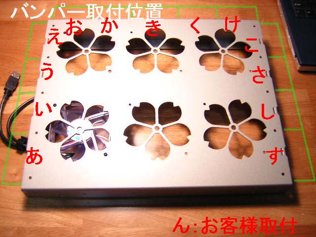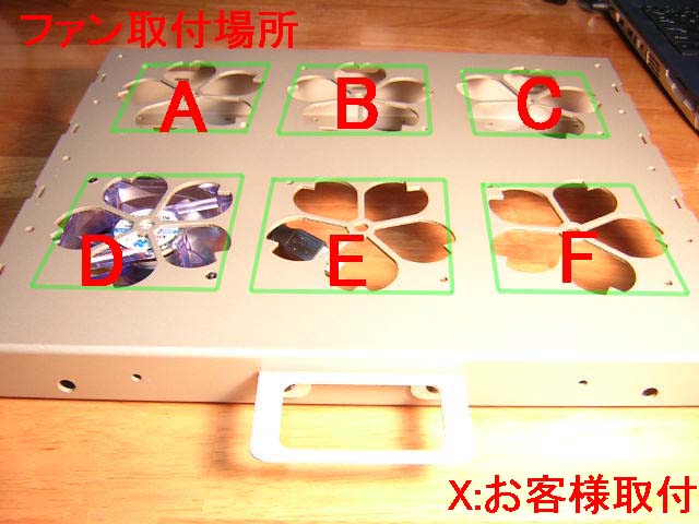 | ファン取付場所の選択 A〜FまたはXから1つ選択してください。 ご指定の場所に取付けて発送します。 写真は「D」を選択した例です。 また、取付位置は簡単に付け替えできます。 |