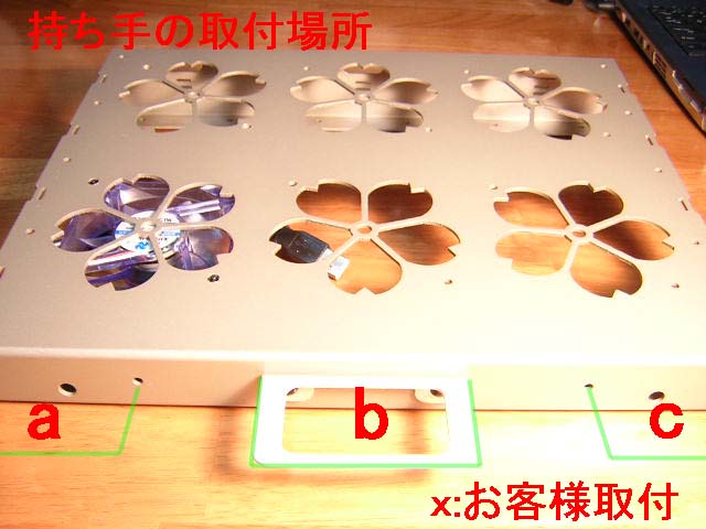 | 持ち手取付場所の選択 a〜cまたはxから1つ選択してください。 ご指定の場所に取付けて発送します。 写真は「b」を選択した例です。 また、取付位置は簡単に付け替えできます。 |